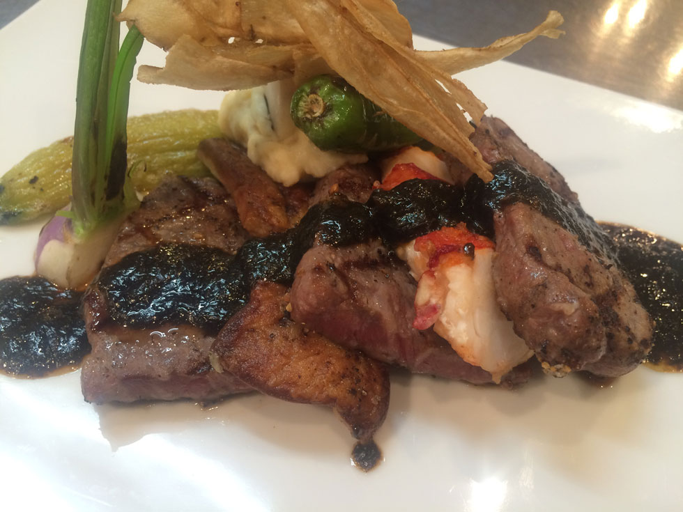 フランス産フォアグラ、北米オマール海老のミルフィーユ ふきのとうバルサミコソースをかけて